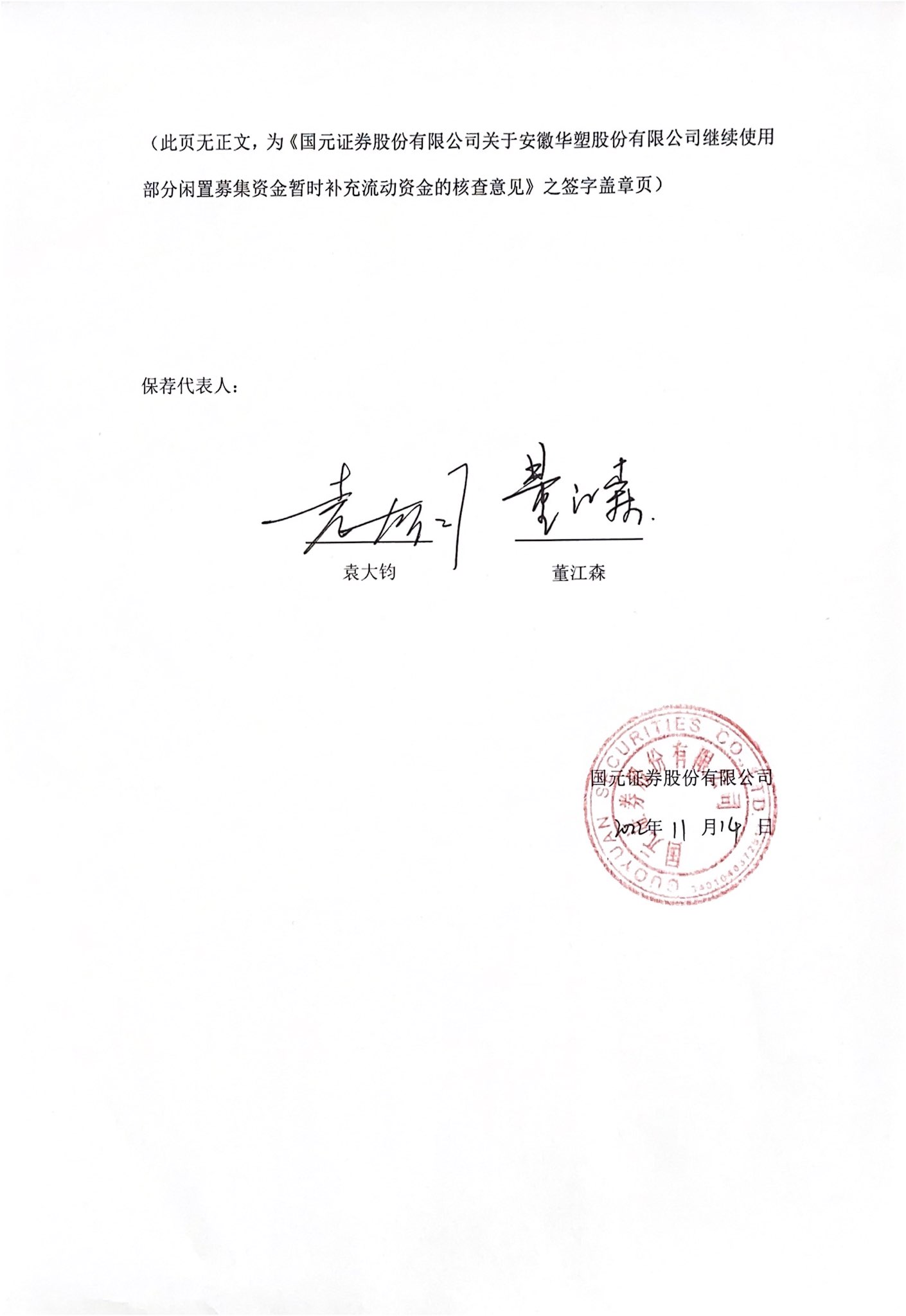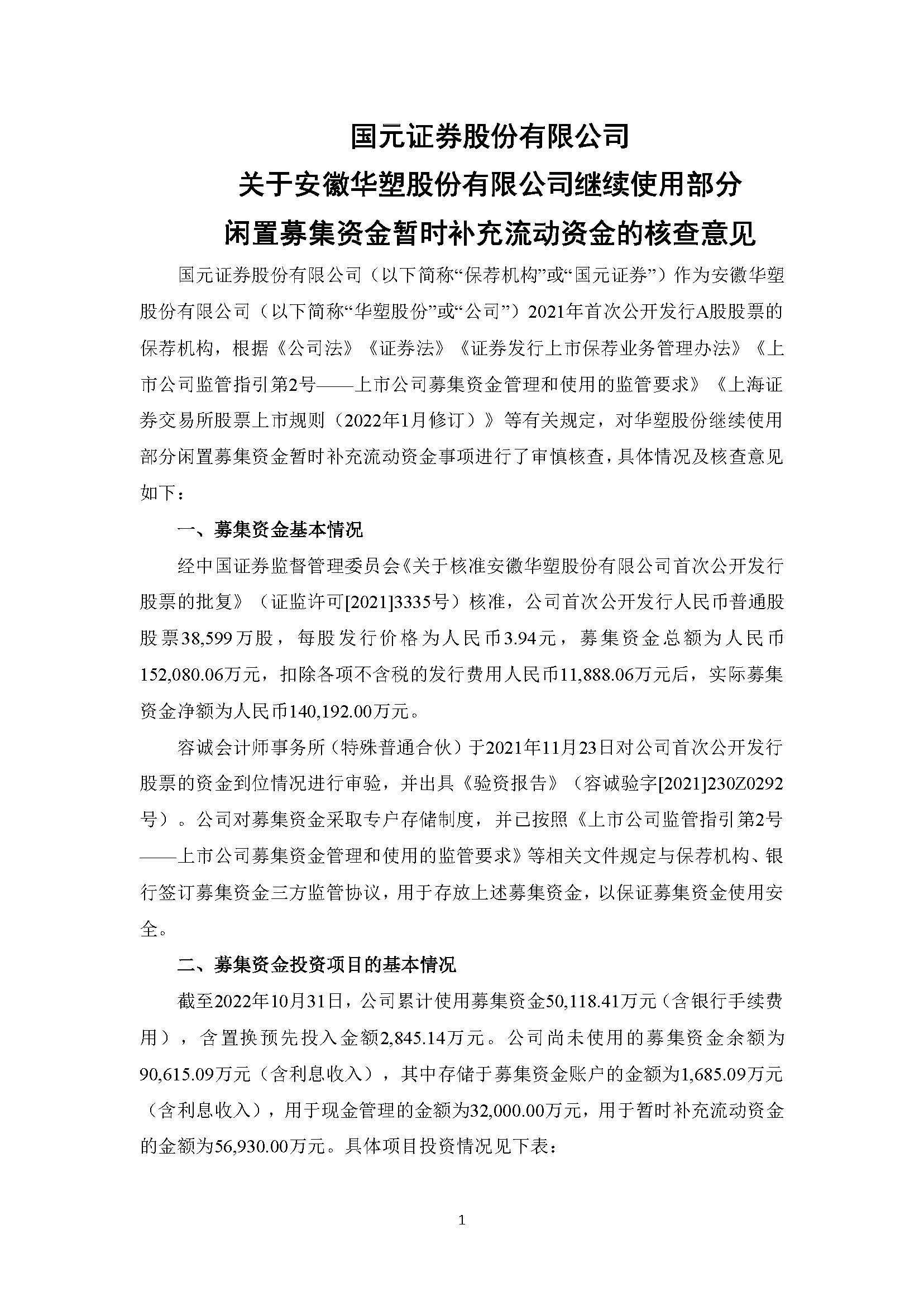 国元证券股份有限公司关于安徽华塑股份有限公司继续使用部分闲置募集资金暂时补充流动资金的核查意见