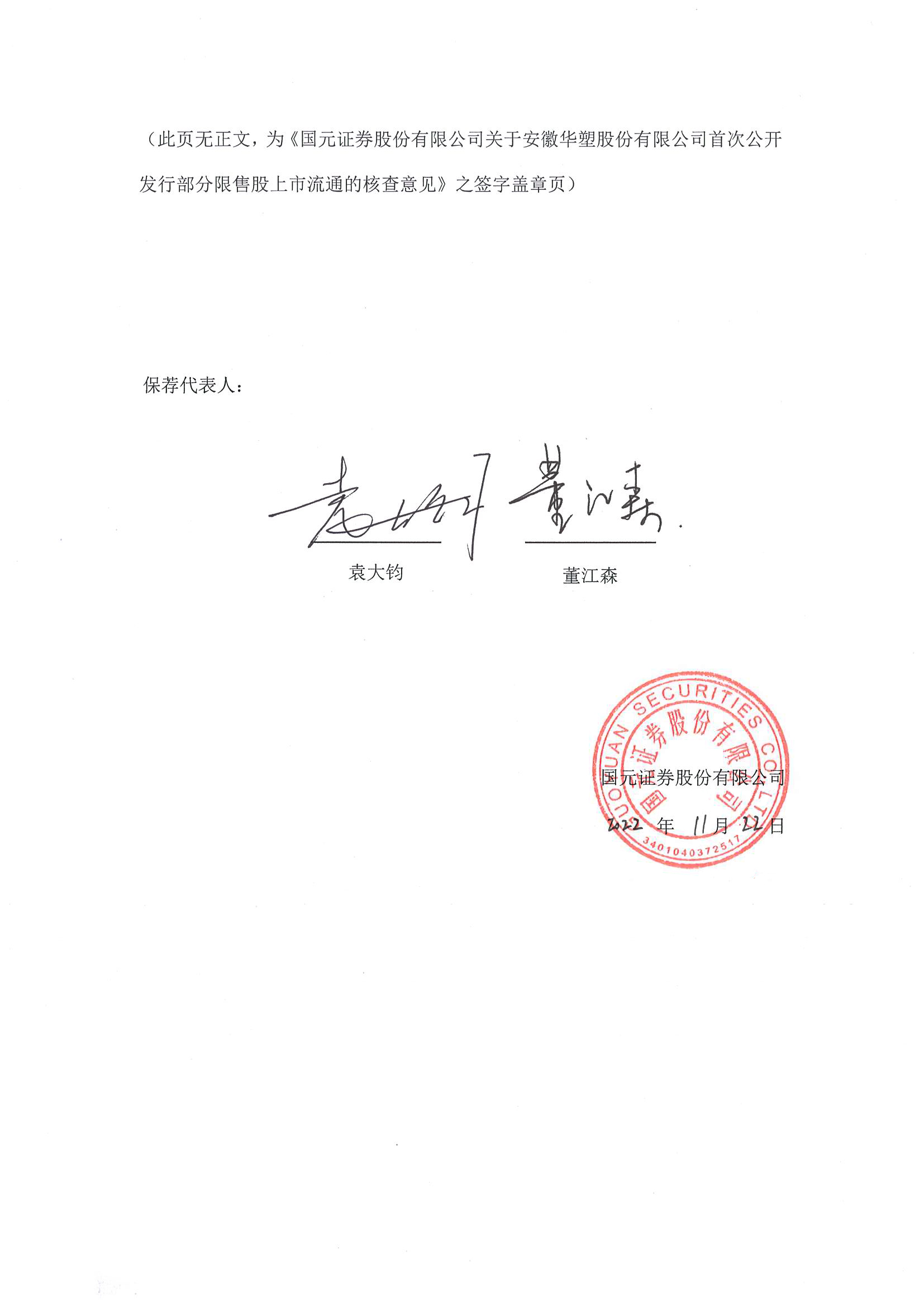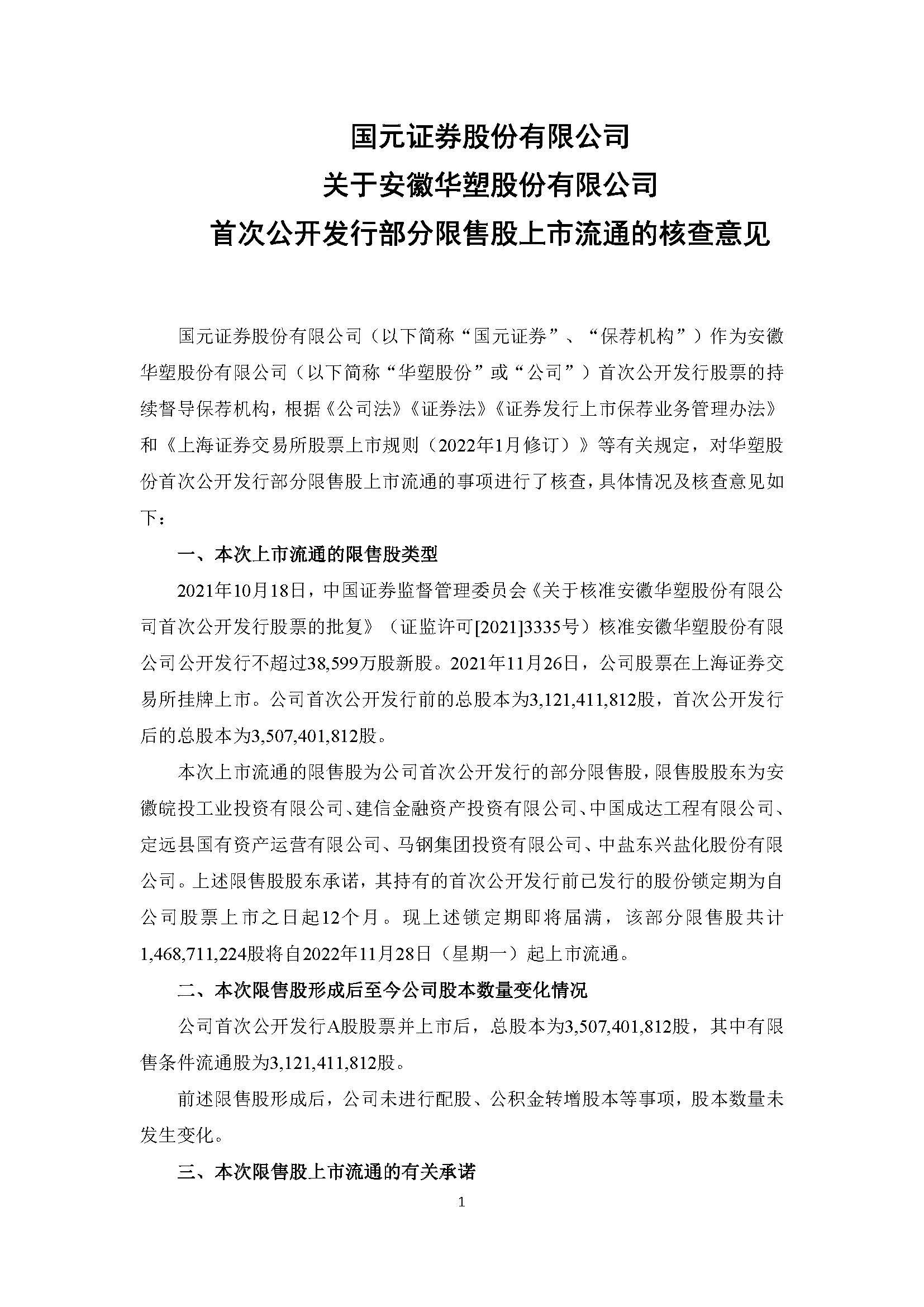 国元证券股份有限公司关于安徽华塑股份有限公司首次公开发行部分限售股上市流通的核查意见