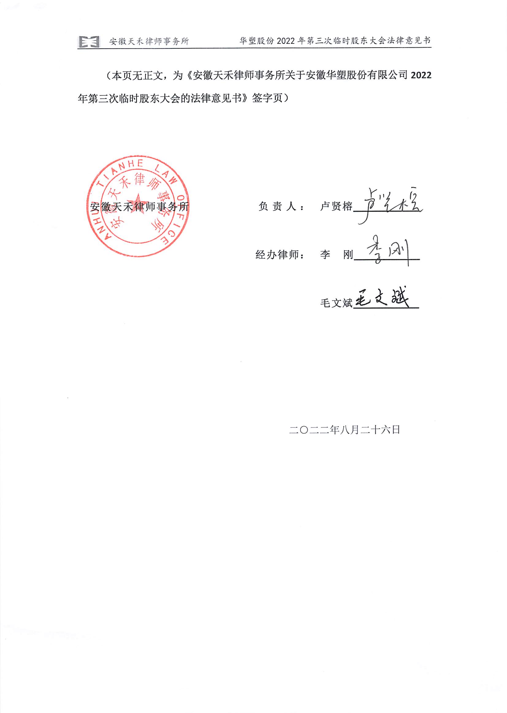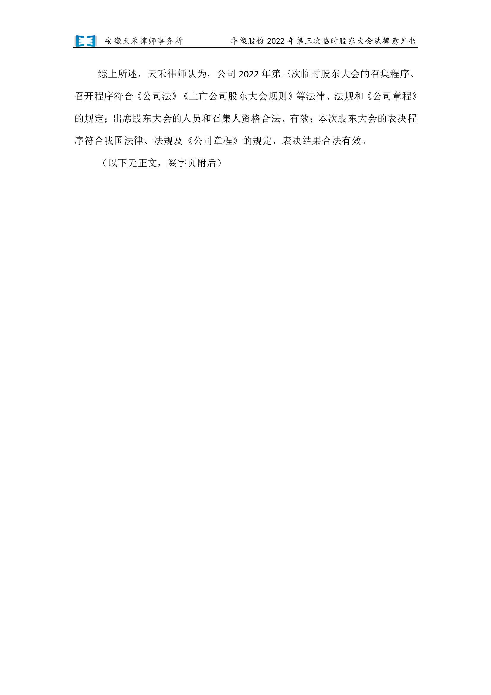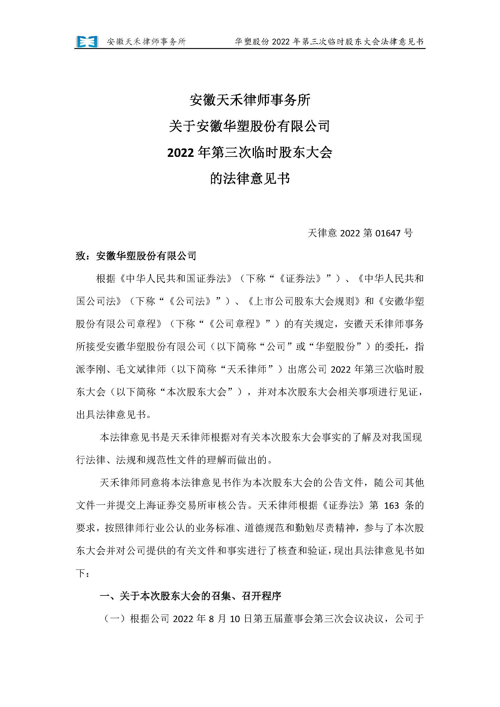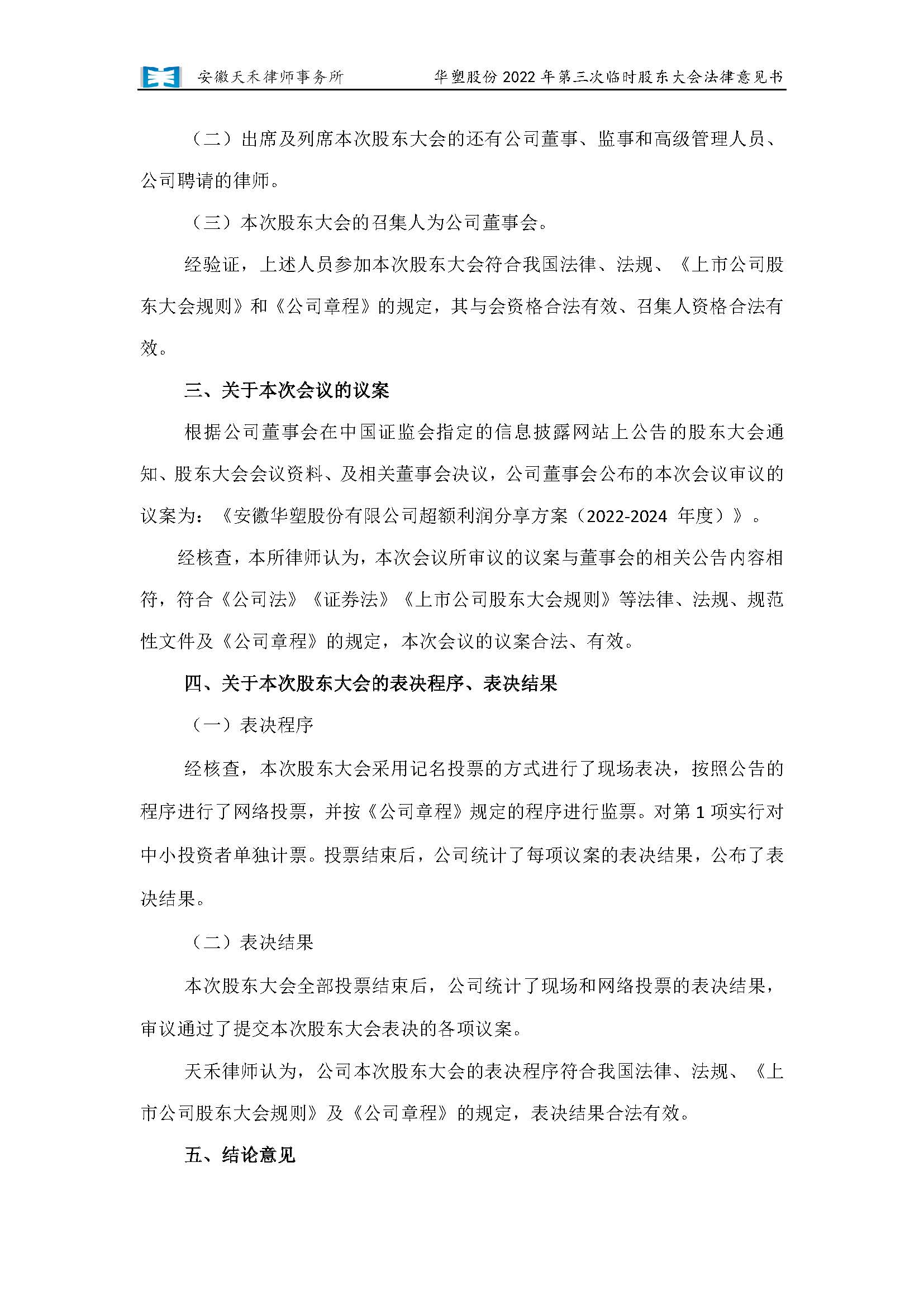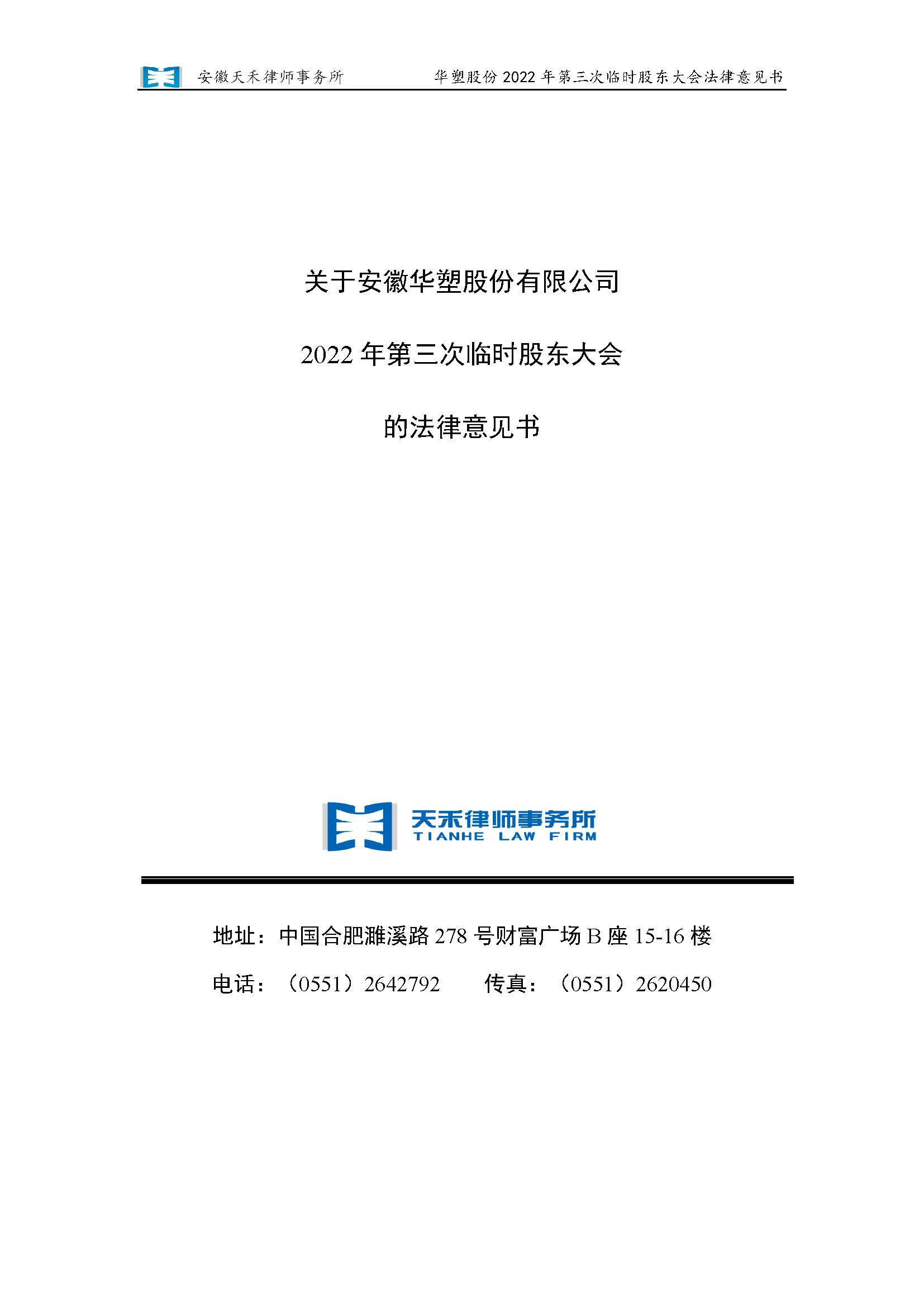 安徽天禾律师事务所关于安徽华塑股份有限公司2022年第三次临时股东大会的法律意见书