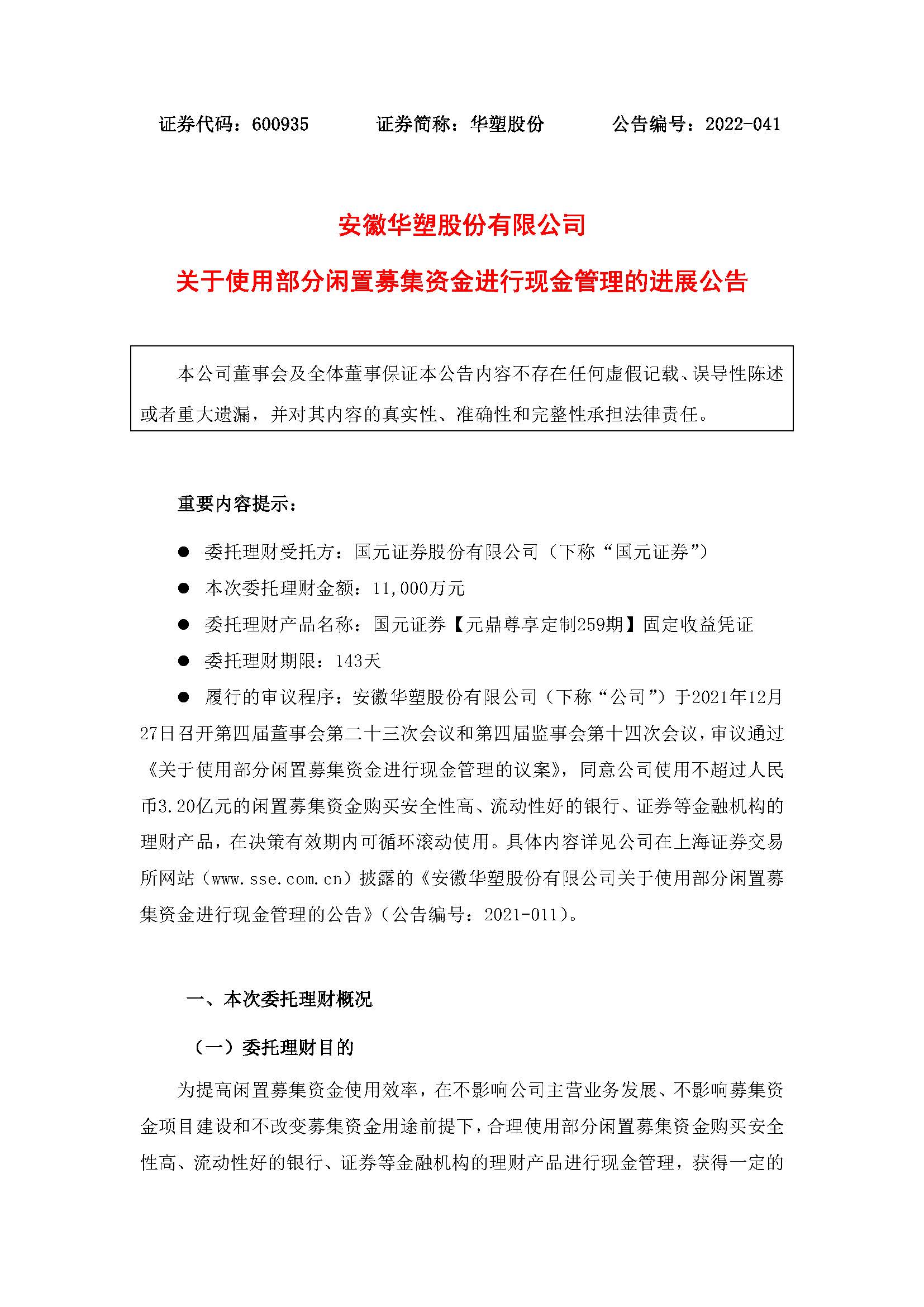 安徽华塑股份有限公司关于使用部分闲置募集资金进行现金管理的进展公告