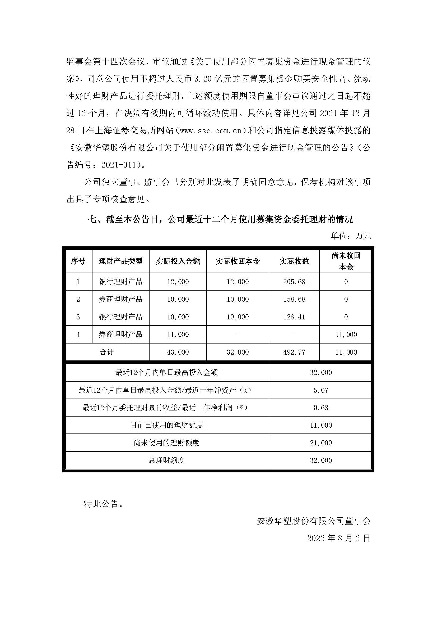 安徽华塑股份有限公司关于使用部分闲置募集资金进行现金管理到期赎回的公告