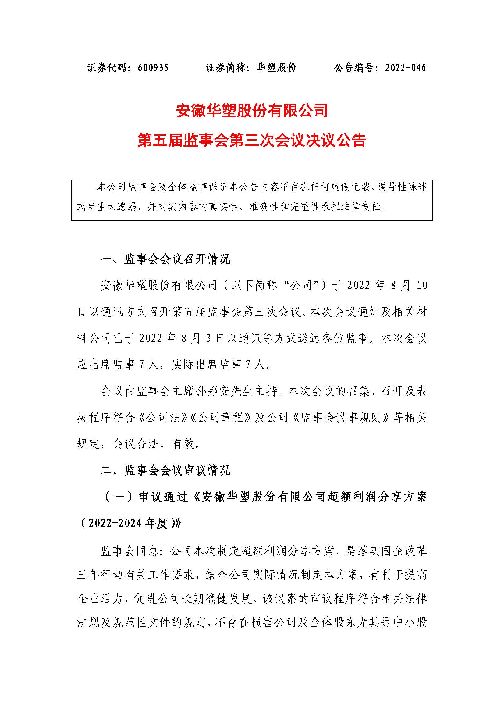 安徽华塑股份有限公司超额利润分享方案(2022-2024年度)