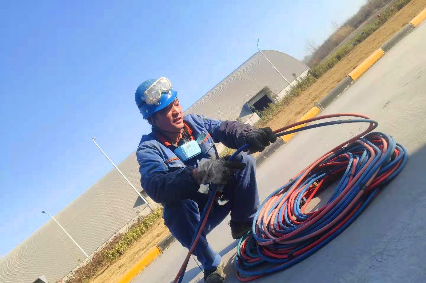 2月20日,水泥分公司烧成车间机修班长闫少会与检修工任亚东在加工煤粉仓空气管道。