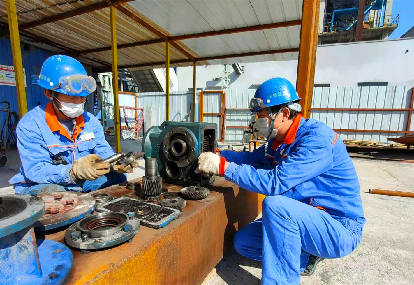2月20日,水泥分公司烧成车间机修班长闫少会与检修工李强在固定搅拌器减速机。