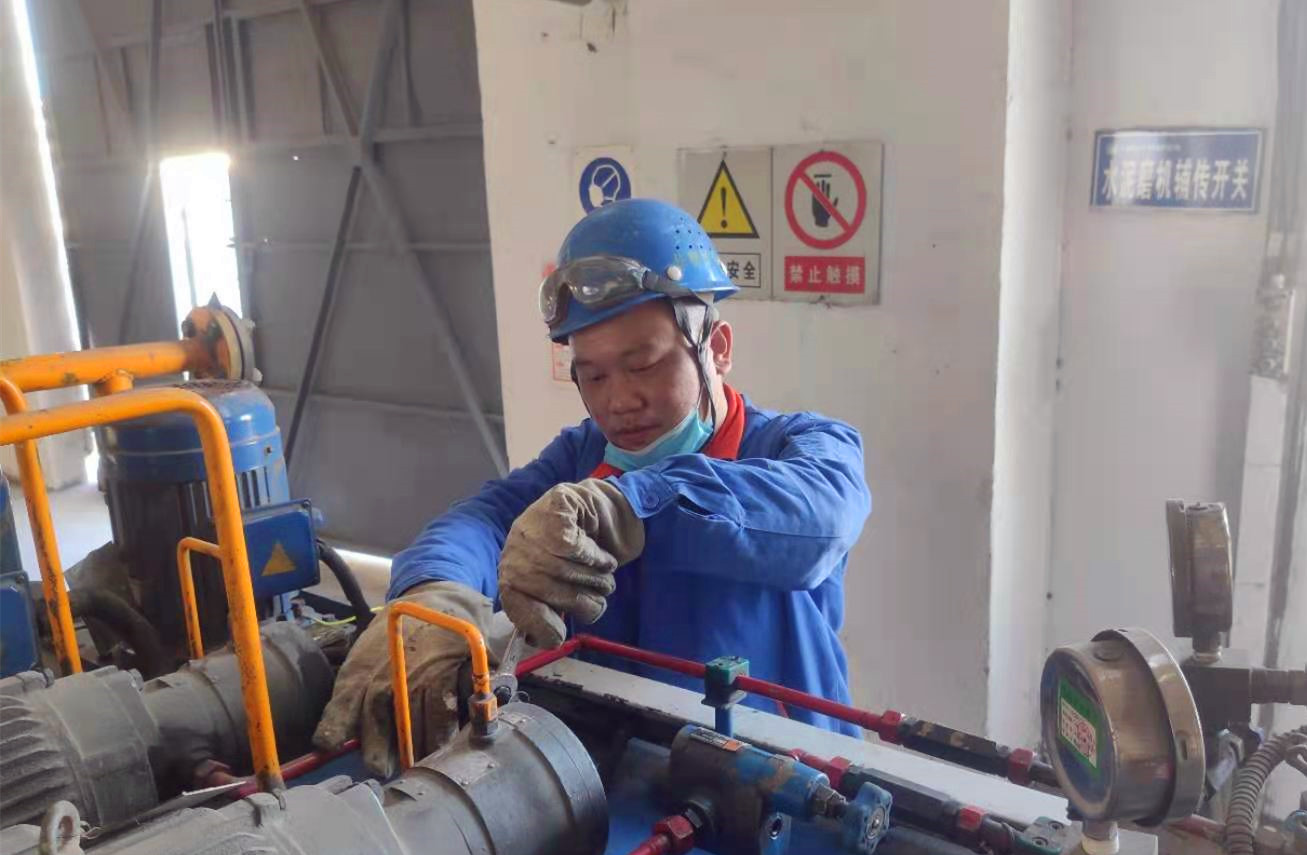图4:水泥分公司水泥车间粉磨班长刘龙在处理磨尾滑履油站漏油。