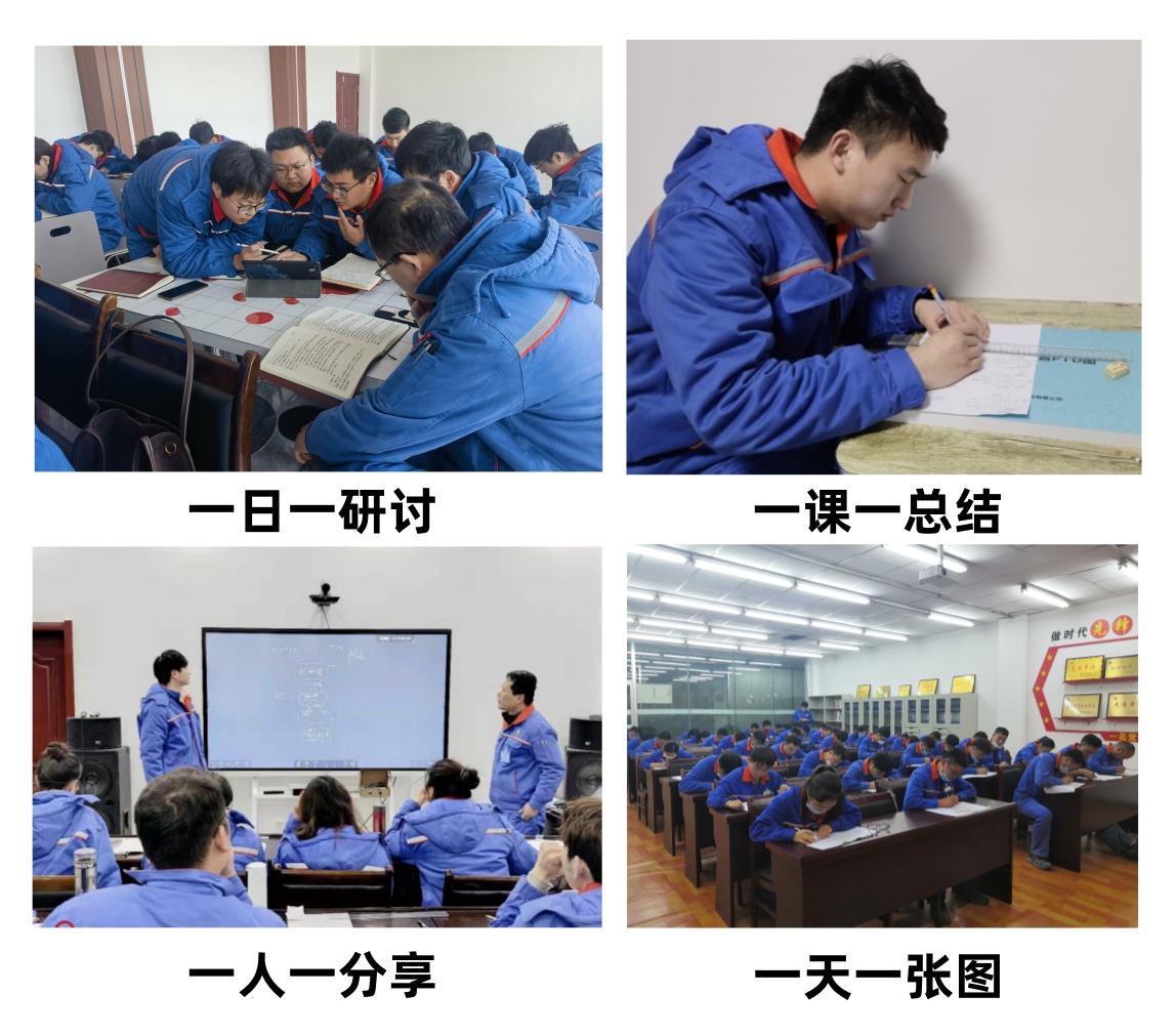 “四个一”即:“一日一研讨”侧重于将学员学习中遇到的疑难问题集中起来,通过集体研讨、集中讨论实现释疑解惑,对研讨中无法解答的问题,由带班管技反馈至授课老师获取问题答案。“一课一总结”由带班管技对课程重点进行梳理,强化学员对重点难点知识的理解和把握。“一人一分享”旨在让学员回顾所学岗位知识,重点对掌握不牢理解不透的知识点,主动拿出来“晒一晒”。“一天一张图”着重要求每名学员针对所学工艺单元手画一张图,从工艺流程图到PDF图,再到PID图,由简到繁、由易至难,一天一学习、一天一进步。