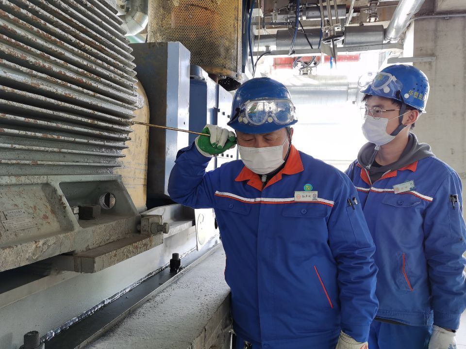 根扎一线,为设备故障“解疑难”。聚合釜是PVC车间的核心装置,是最重要、也是最危险的装置。2022年7月2日23:16, PVC车间三线巡检人员发现L05动端有异味、异响,随后产生了火花。巡检人员不知所措,情况万分紧急。正在宿舍休息的孙卓利接到电话,简单询问后,他以最快速度赶到现场,经过排查,最终确定是气封、轴承故障。孙卓利立即对设备进行拆除检修,直到次日早上8点55分恢复正常。去年检修,他“全副武装”钻进充满大块自聚物的聚合釜内,拿着高压清洗枪对釜内自聚物进行清洗,一块块顽固的自聚物从釜壁上脱落下来,时间长达三个多小时。