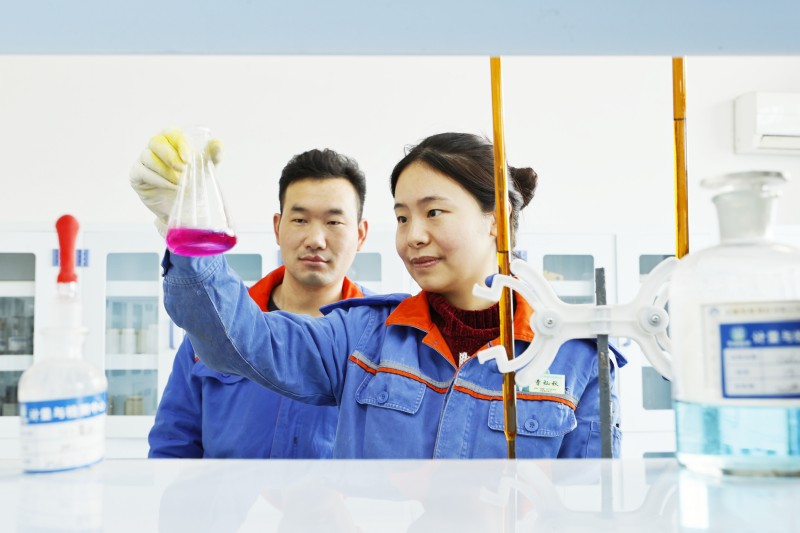图为曹灿秋(右)在做50碱液分析
