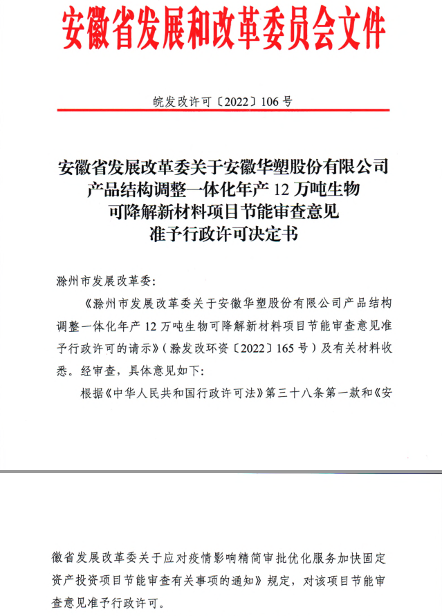 8月24日,安徽省发展改革委下发文件:对华塑股份有限公司PBAT项目(年产12万吨生物可降解新材料)节能审查意见准予行政许可。这是继光伏发电项目后,该公司高质量发展取得的又一阶段性成果。