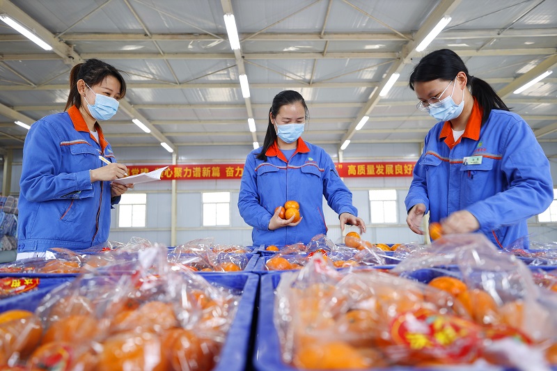 4月10日上午,华塑股份公司三名职工在分领沃柑。