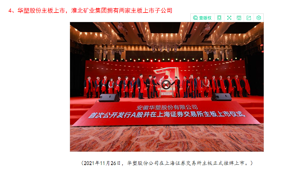 近日,华塑股份成功上市入选淮北矿业集团2021年十大新闻,进一步助力淮北矿业集团优化产业结构、做大化工板块,同时有利于企业实现多渠道、低成本融资,增强抵御风险和可持续发展能力,为安徽省“三地一区”建设提供优质、绿色能源保障。