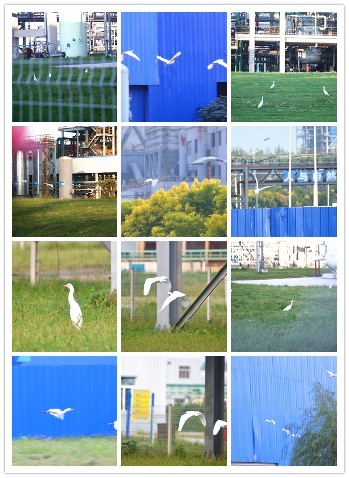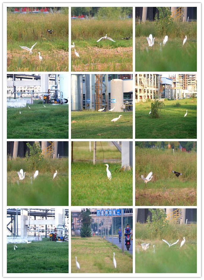 在初秋湛蓝的天空中,它们成群结队,时而在管廊桥架上空盘旋,时而拍翅降落在绿化带上。它们扑扇着翅膀奔跑在水塘边的浅水里,把雪白的身影映在清澈的水面上。它们迈着长腿走在刚刚修剪过的草丛中,悠然自得,向人们展现自己独特的姿态,抑或昂头挺胸提起一只脚,用另一只脚站立张望马路上过往的车辆与行人。看样子,它们已经把这里当作休憩、生存的乐园。