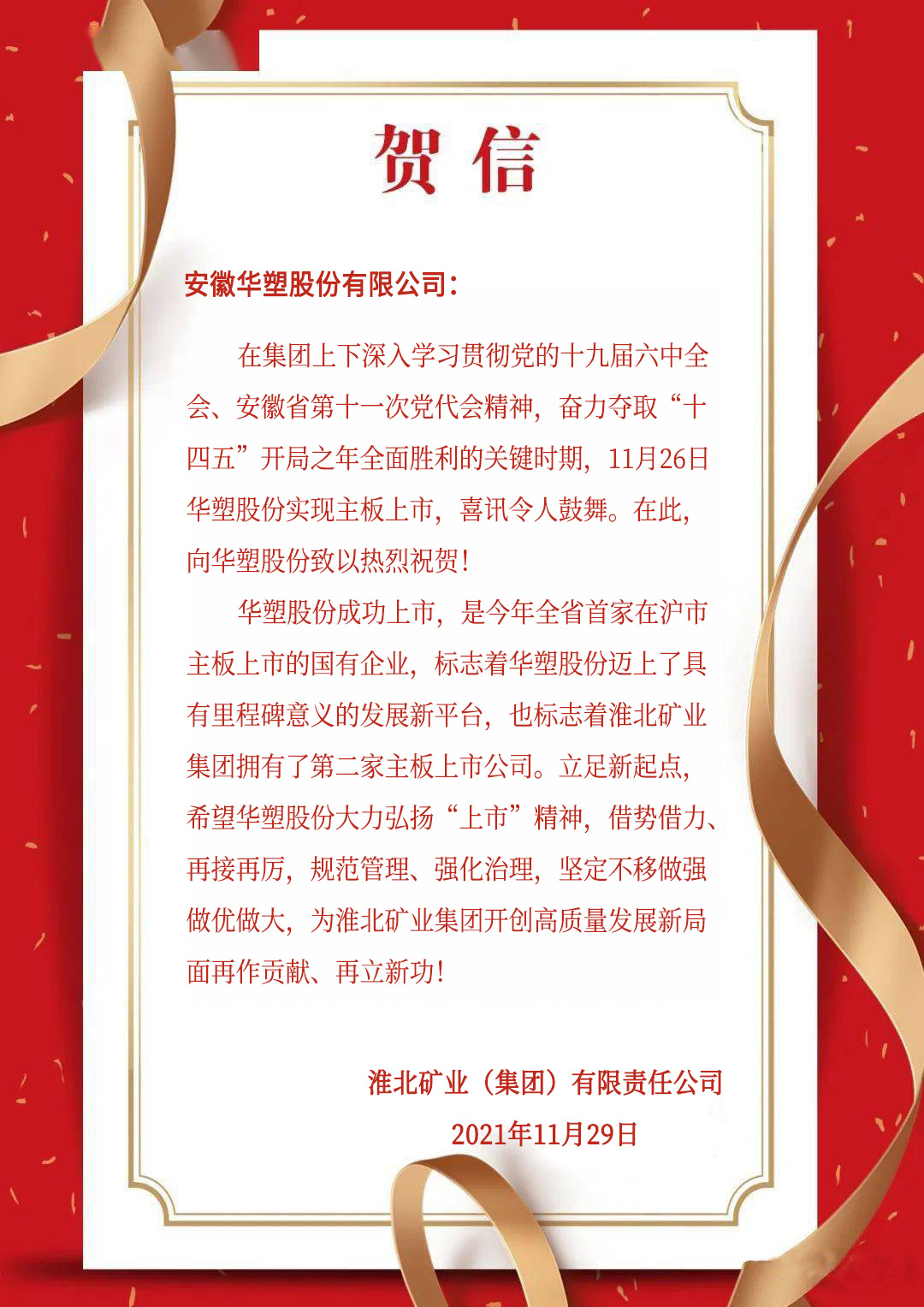 【淮北矿业贺信】淮北矿业集团给华塑股份上市的贺信
