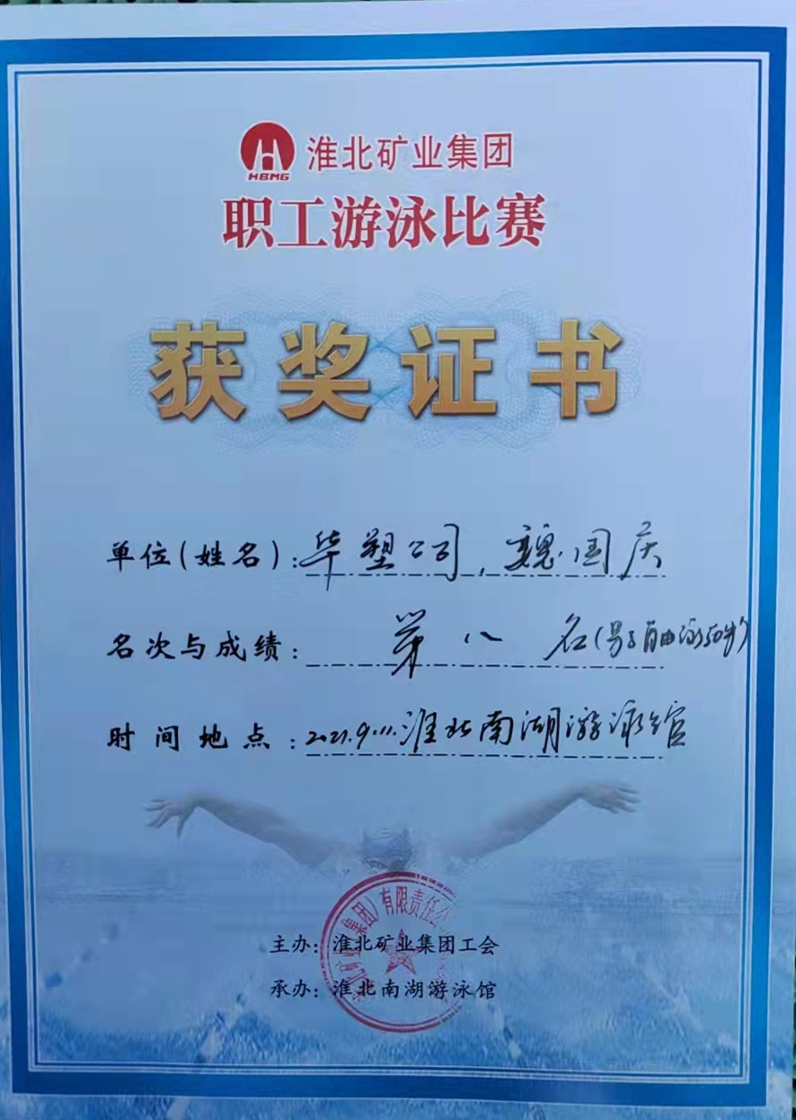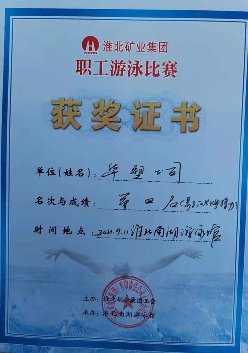 9月11日,在淮北矿业集团职工游泳比赛中,华塑股份获得男子50米接力赛第四名与男子自由泳50米第八名的好成绩,刷新了华塑股份游泳运动的空白,为企业赢得了荣誉。