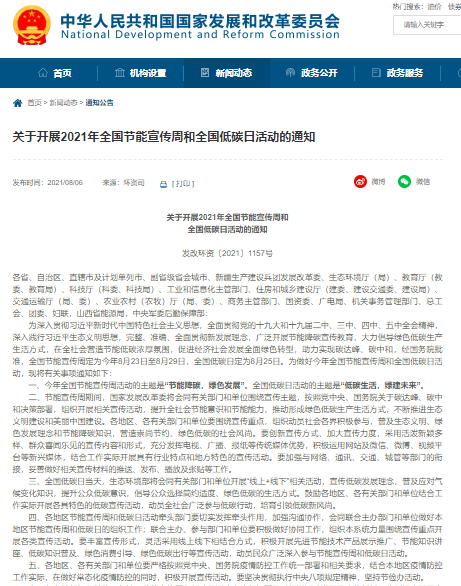 为深入贯彻习近平新时代中国特色社会主义思想,全面贯彻党的十九大和十九届二中、三中、四中、五中全会精神,深入践行习近平生态文明思想,完整、准确、全面贯彻新发展理念,广泛开展节能降碳宣传教育,大力倡导绿色低碳生产生活方式,在全社会营造节能低碳浓厚氛围,促进经济社会发展全面绿色转型,助力实现碳达峰、碳中和,经国务院批准,全国节能宣传周定为今年8月23日至8月29日,全国低碳日定为8月25日。为做好今年全国节能宣传周和全国低碳日活动,现将有关事项通知如下: