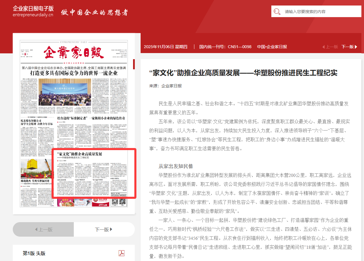 《企业家日报》11月6日一版:“家文化”助推企业高质量发展——华塑股份推进民生工程纪实