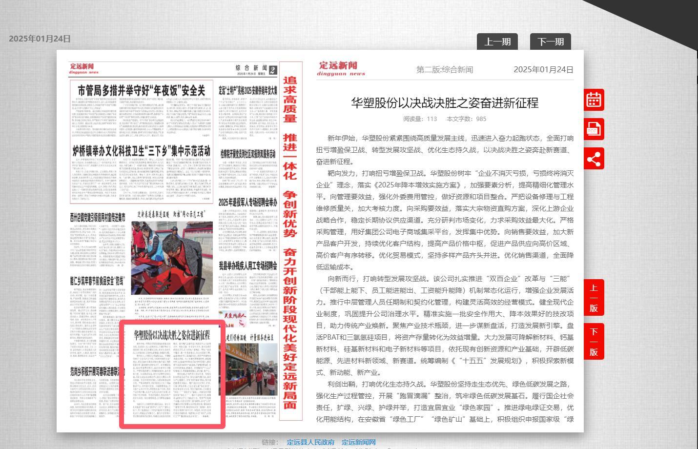 《滁州日报-定远新闻》1月24日二版:华塑股份以决战决胜之姿奋进新征程