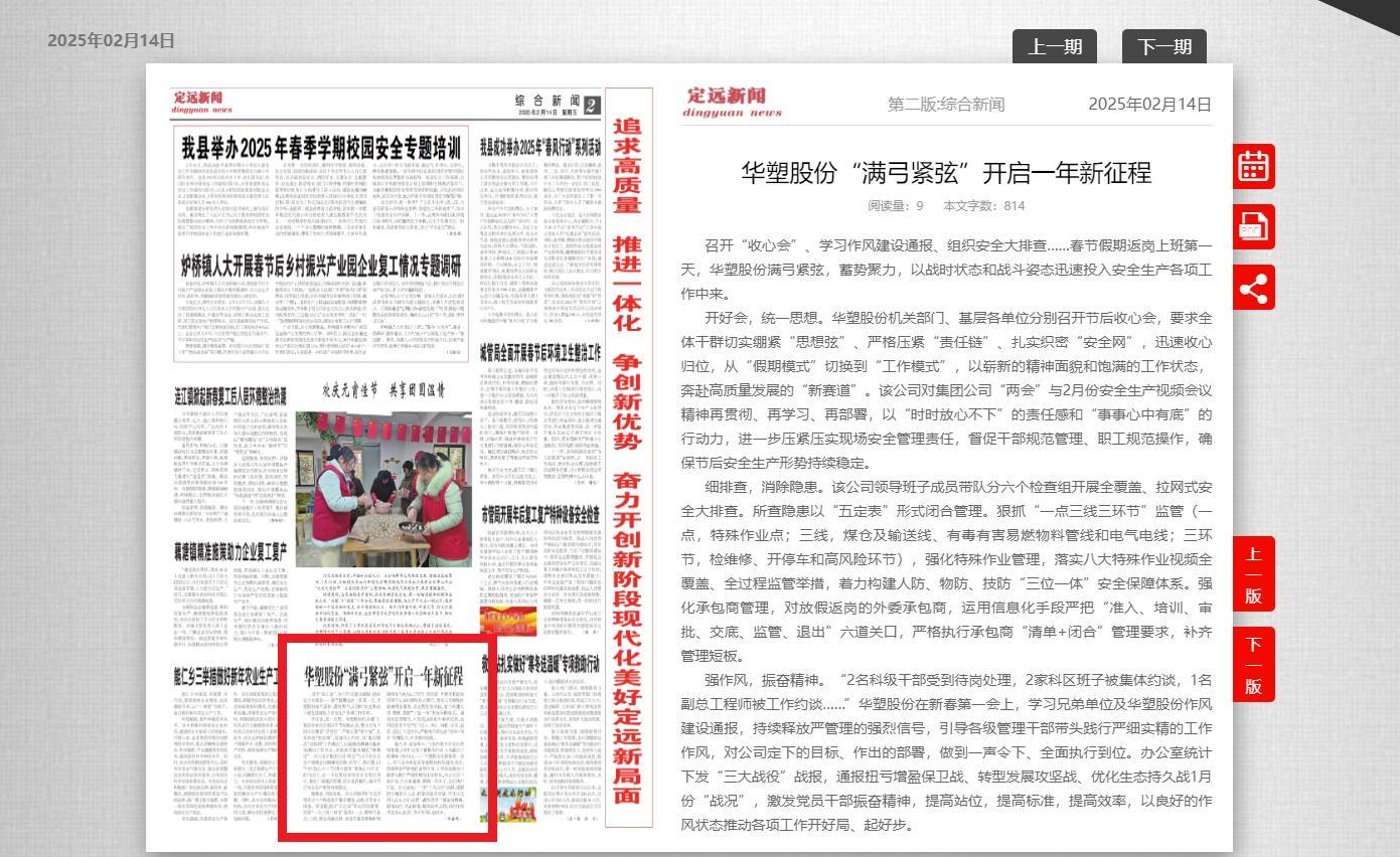 《滁州日报-定远新闻》2月14日二版:华塑股份“满弓紧弦”开启一年新征程
