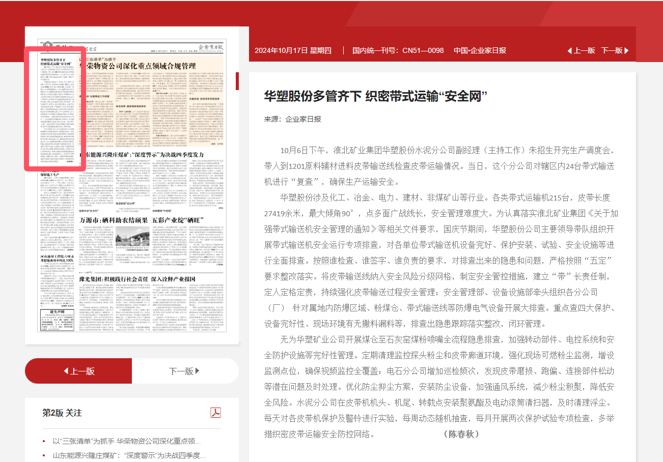 《企业家日报》10月17日二版:华塑股份多管齐下 织密带式运输“安全网”