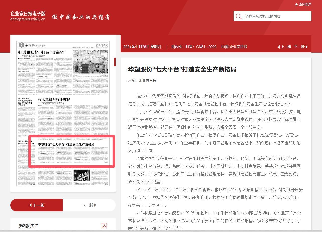 《企业家日报》11月28日二版:华塑股份“七大平台”打造安全生产新格局