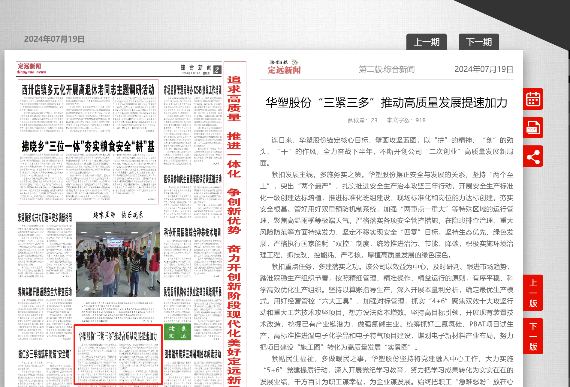 《滁州日报-定远新闻》7月19日二版:华塑股份“三紧三多”推动高质量发展提速加力