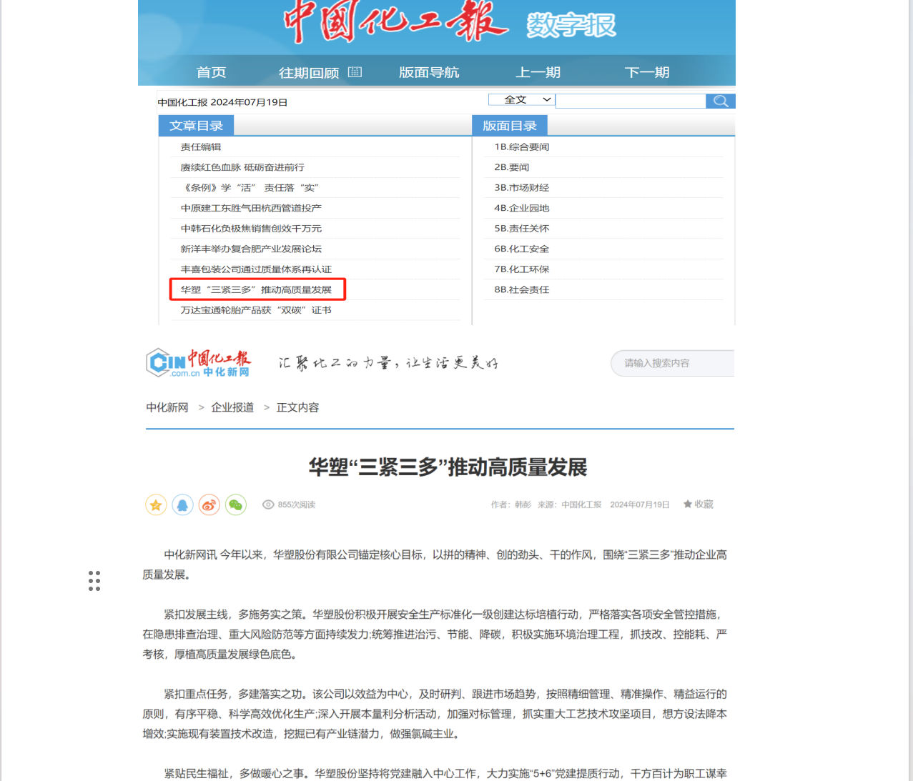《中国化工报》7月19日四版:华塑“三紧三多”推动高质量发展