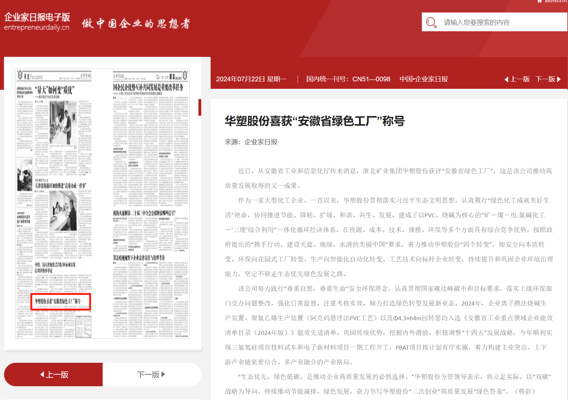 《企业家日报》7月22日2版:华塑股份喜获“安徽省绿色工厂”称号