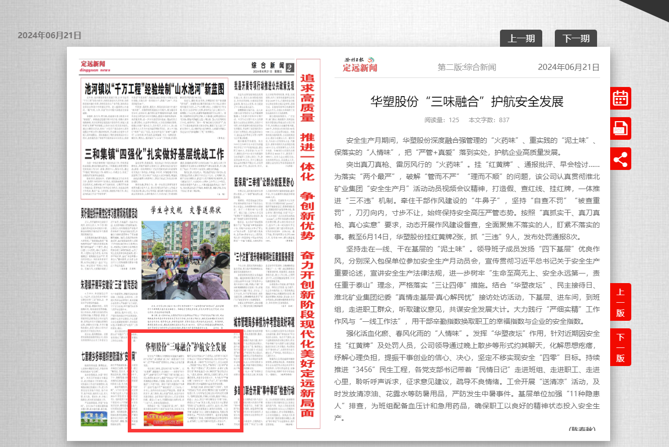 《滁州日报-定远新闻》6月21日二版:华塑股份“三味融合”护航安全发展