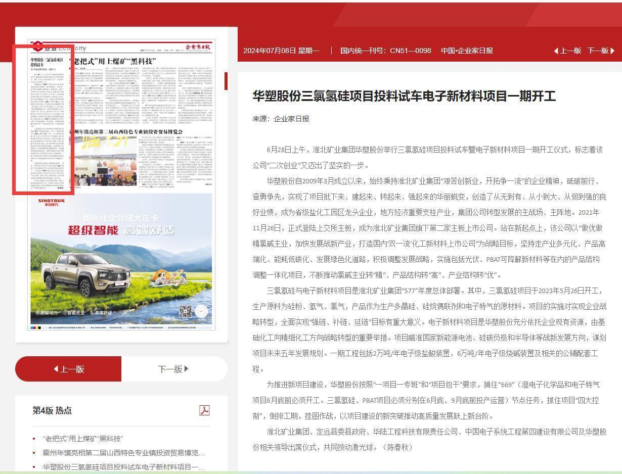 《企业家日报》7月8日四版:华塑股份三氯氢硅项目投料试车电子新材料项目一期开工