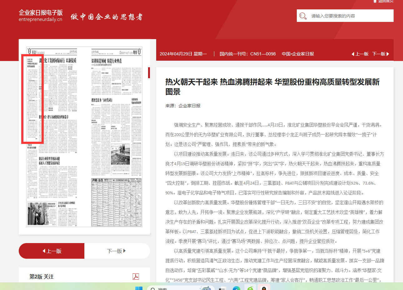 《企业家日报》4月29日二版头条:热火朝天干起来 热血沸腾拼起来 华塑股份重构高质量转型发展新图景