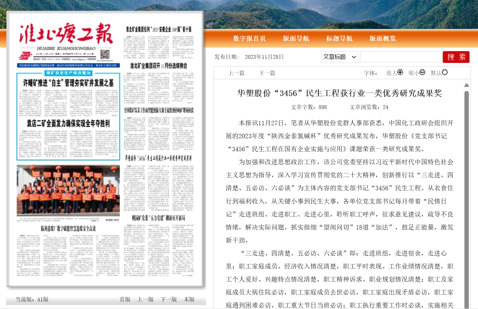 《淮北矿工报》11月28日一版:华塑股份“3456”民生工程获行业一类优秀研究成果奖