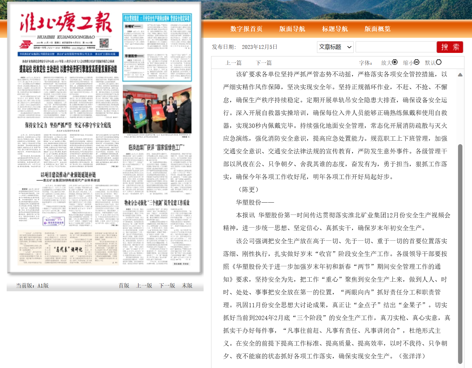 《淮北矿工报》12月5日一版报眼:传达贯彻集团12月份安全生产视频会精神营造安全稳定环境