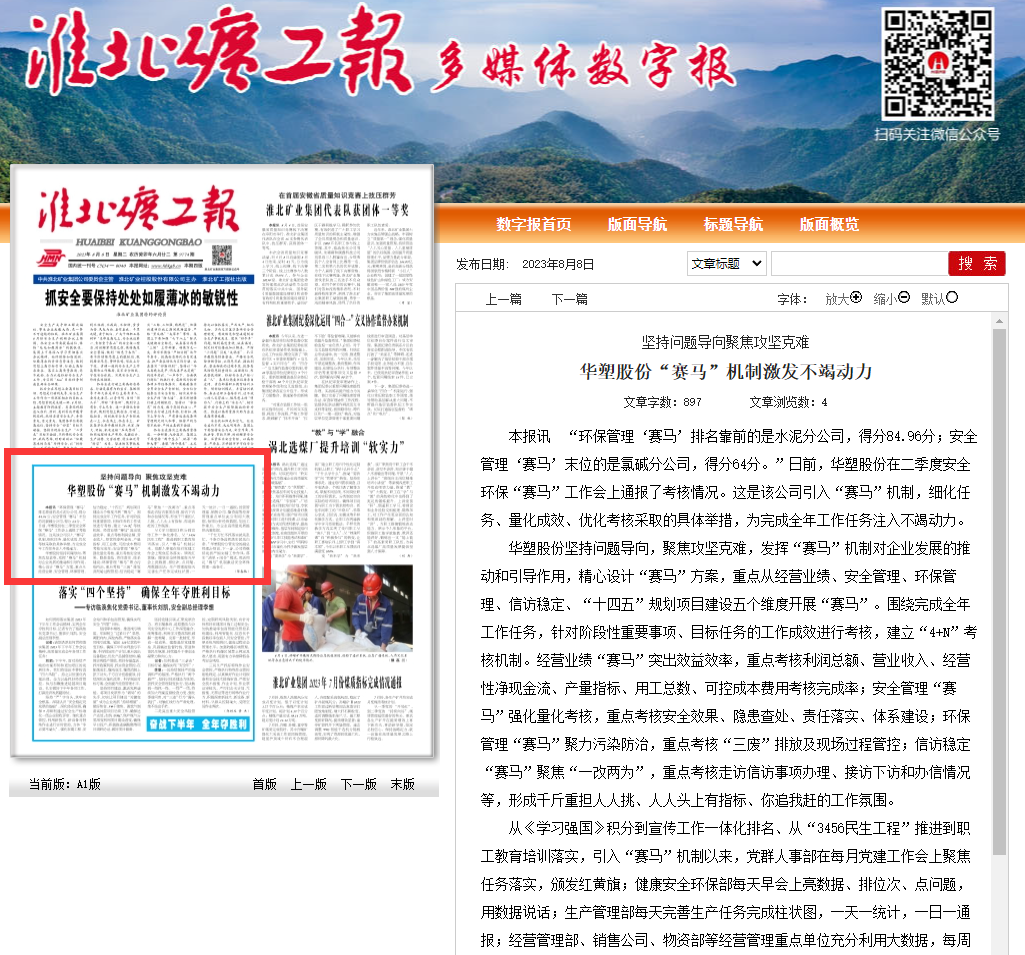 《淮北矿工报》8月8日一版:华塑股份“赛马”机制激发不竭动力