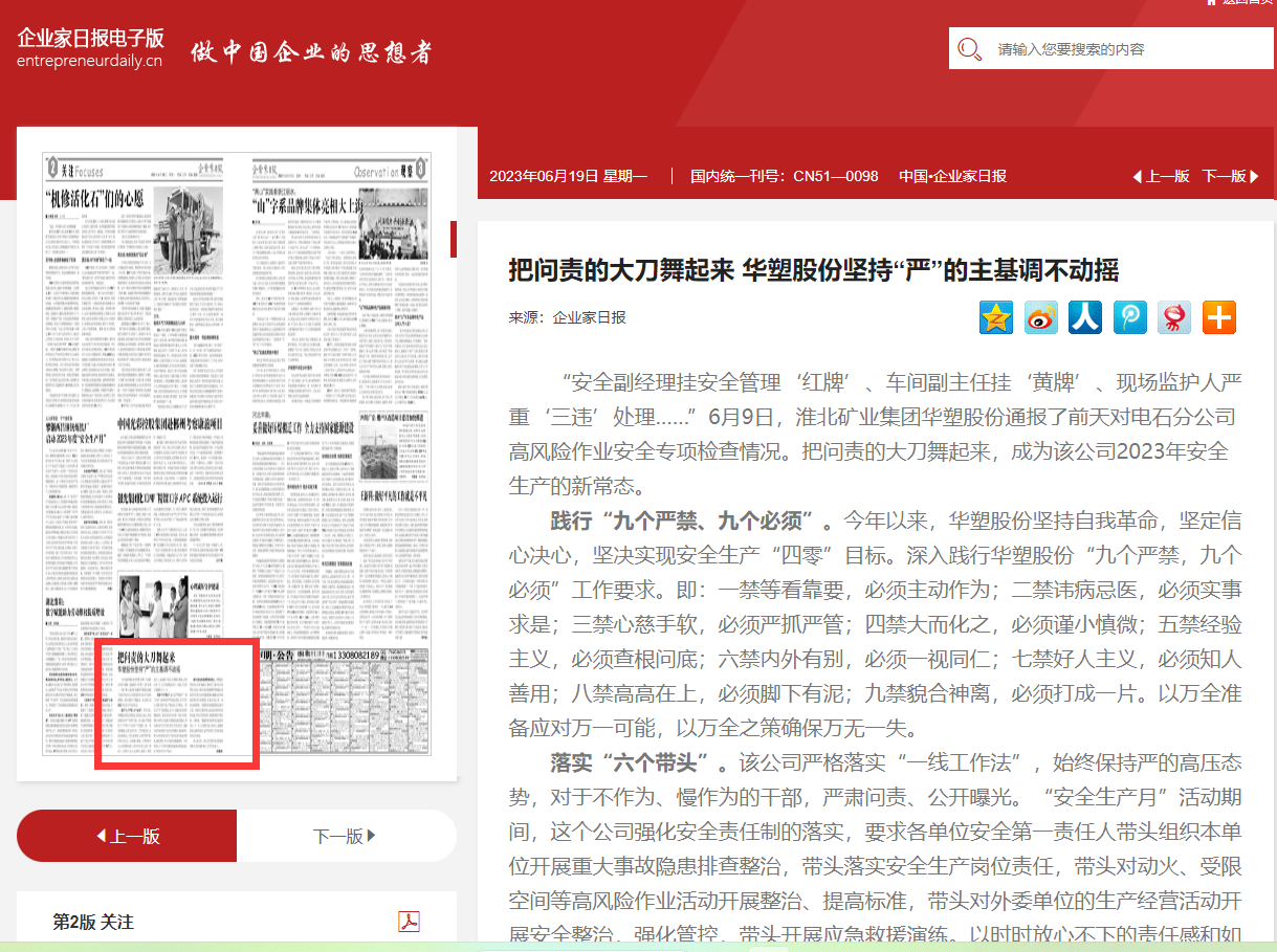 《企业家日报》6月19日四版:把问责的大刀舞起来 华塑股份坚持“严”的主基调不动摇