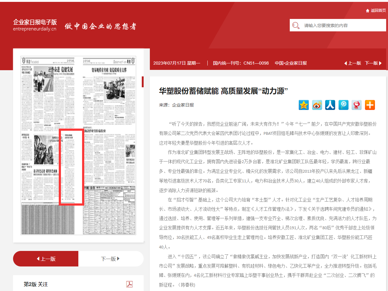 《企业家日报》7月17日二版:华塑股份蓄储赋能 高质量发展“动力源”