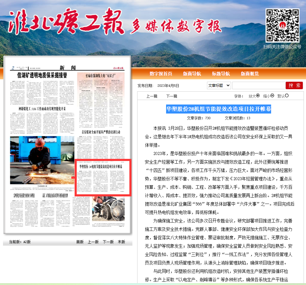 《淮北矿工报》4月5日二版:华塑股份2#机组节能提效改造项目拉开帷幕