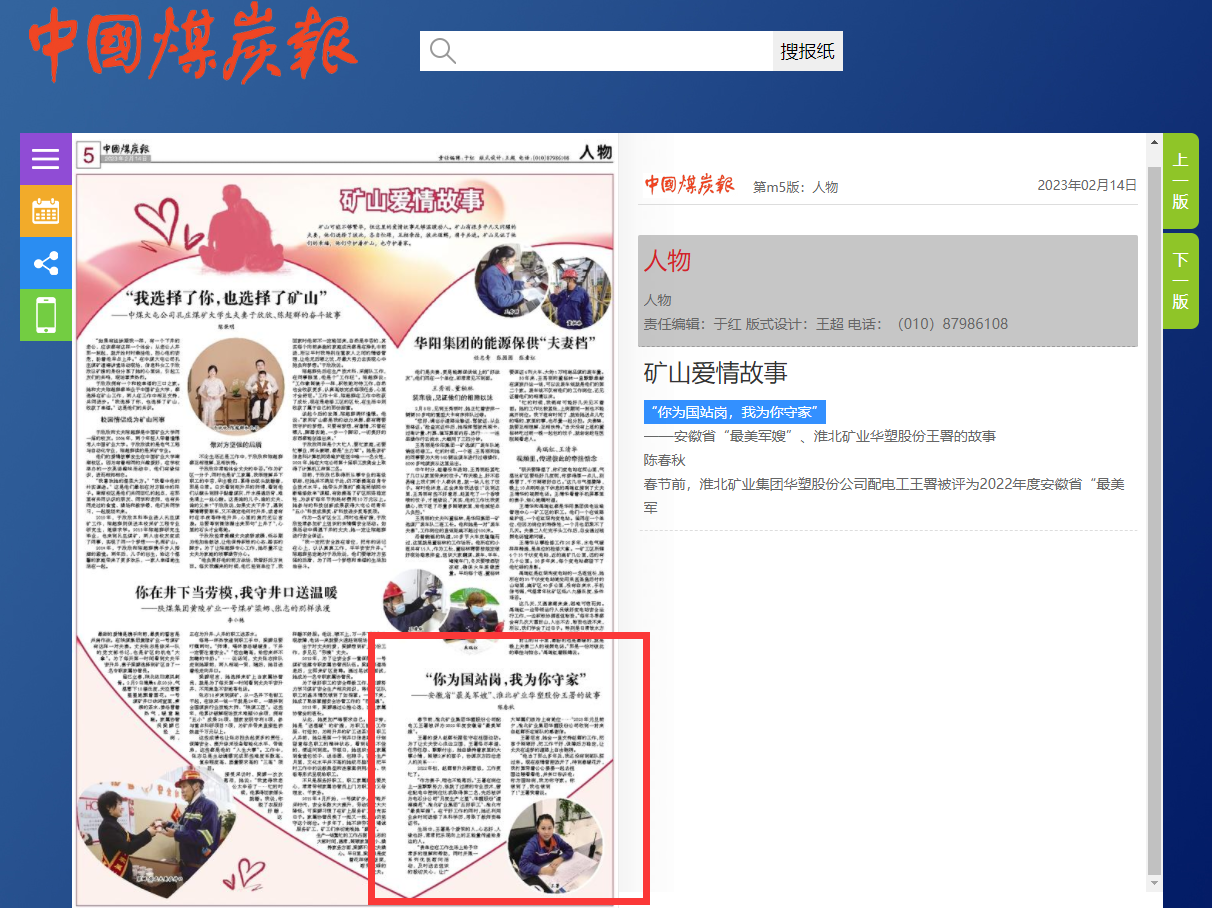 《中国煤炭报》2月14日五版:“你为国站岗,我为你守家”——安徽省“最美军嫂”、淮北矿业华塑股份王署的故事
