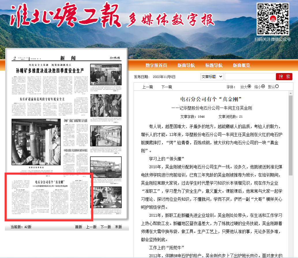 《淮北矿工报》11月5日二版:电石分公司有个“真金刚”——记华塑股份电石分公司一车间主任吴金刚