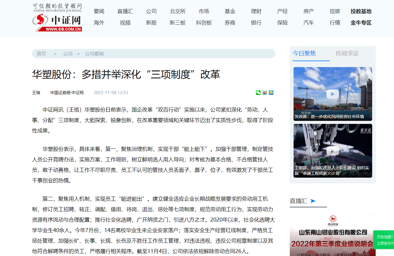 《中国证券报·证券网》11月8日:华塑股份:多措并举深化“三项制度”改革
