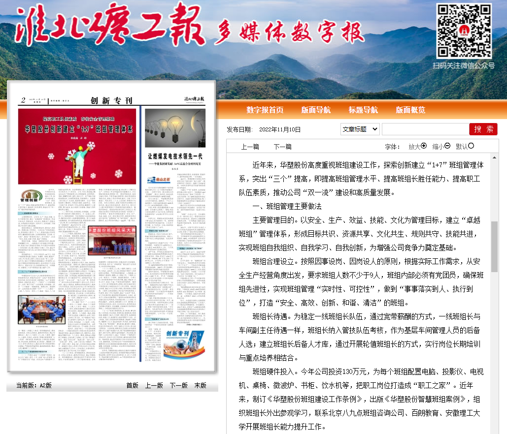 《淮北矿工报》11月10日二版头条:华塑股份创新建立“1+7”班组管理体系