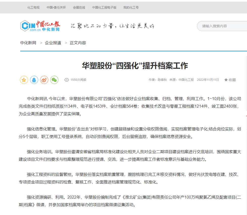 《中国化工报》11月11日:华塑股份“四个强化“提升档案管理质量