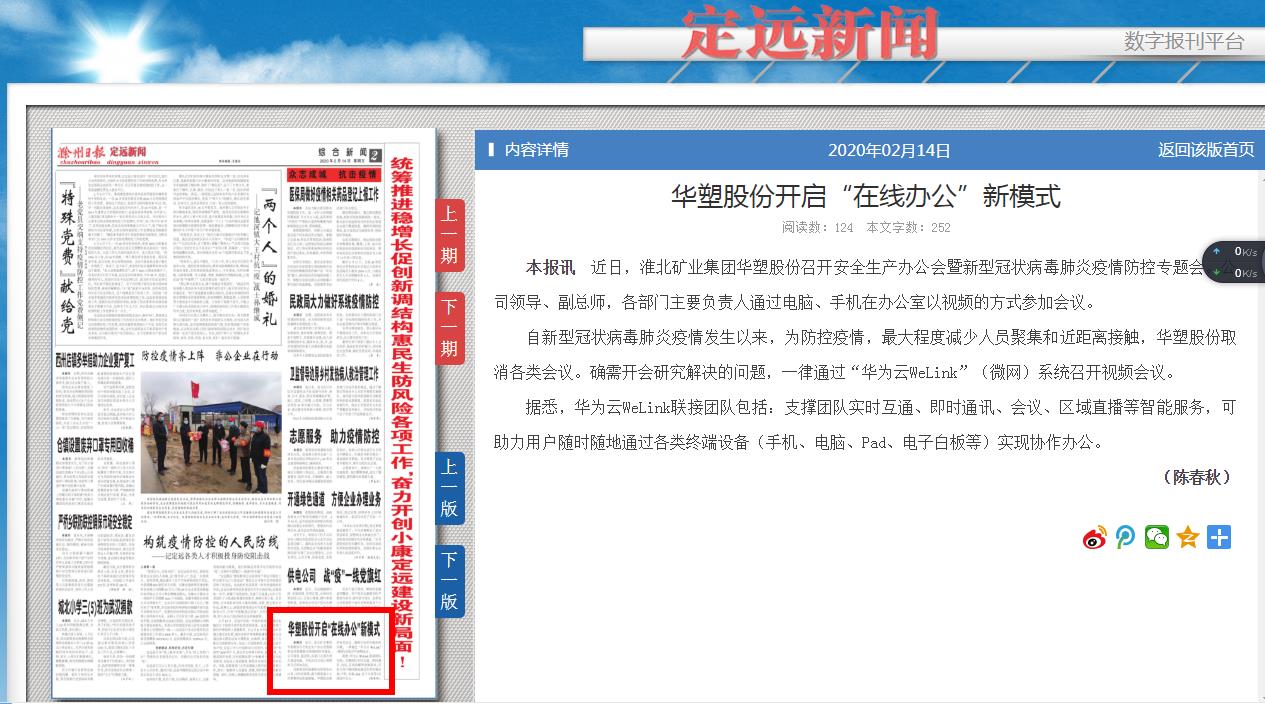 《滁州日报-定远新闻》2月14日二版:华塑股份开启“在线办公”新模式