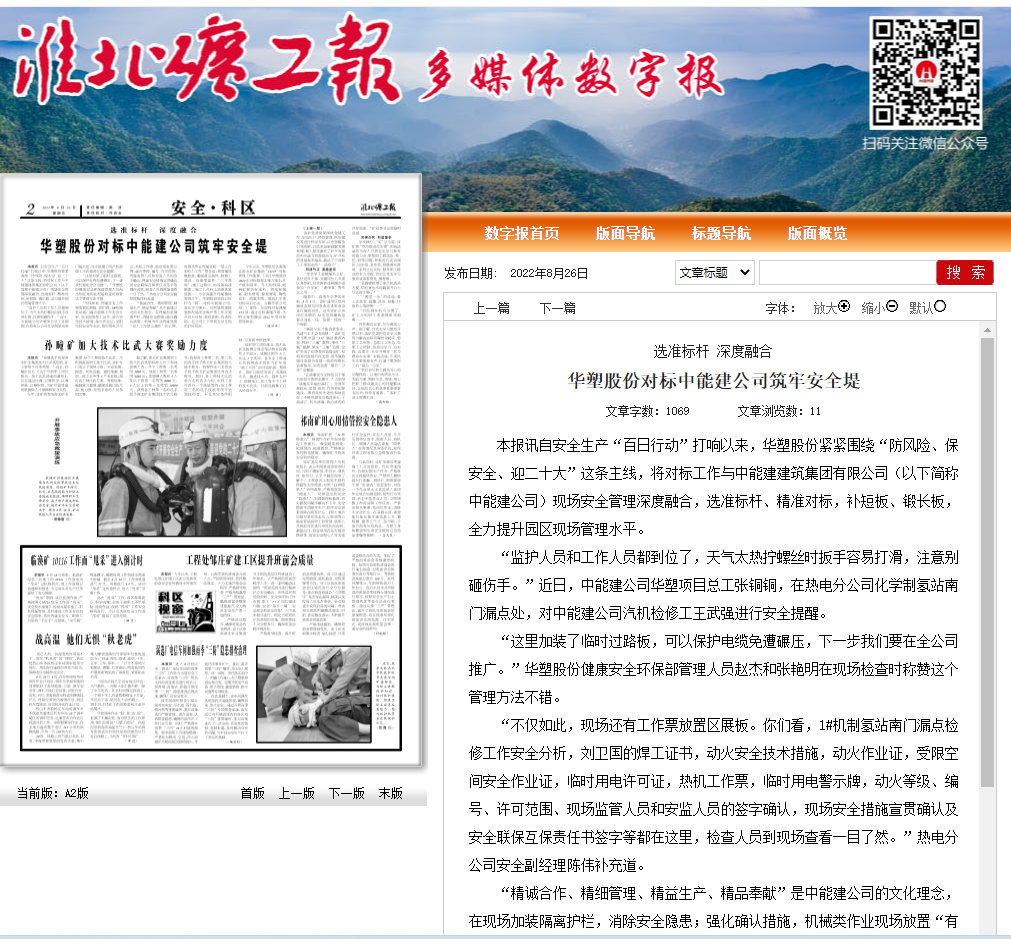 《淮北矿工报》8月26日二版头条:华塑股份对标中能建公司筑牢安全堤