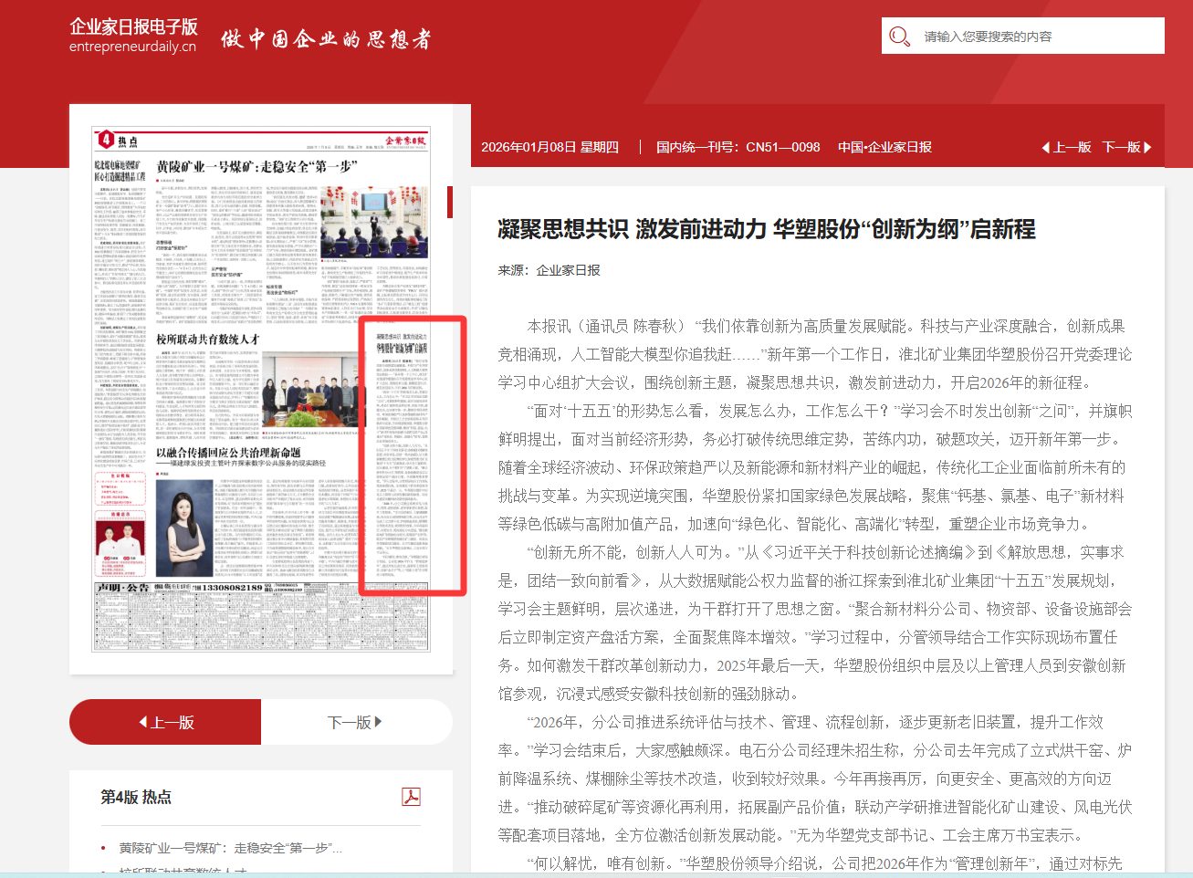 《企业家日报》1月8日四版:凝聚思想共识 激发前进动力 华塑股份“创新为纲”启新程
